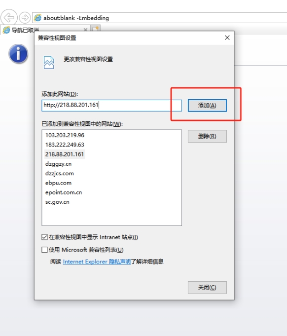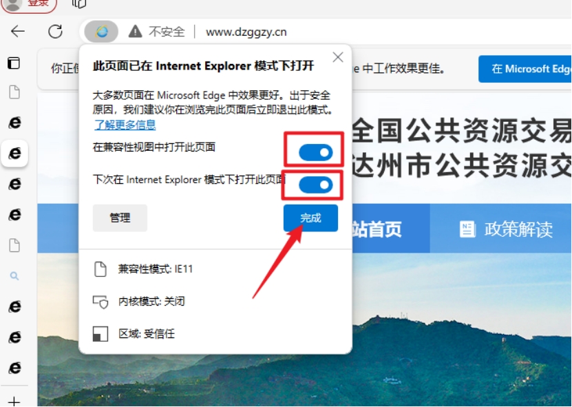 2.3浏览器兼容视图设置,点击浏览器地址左侧按钮,将下图所示的两个按钮点开,点击完成按钮即可。