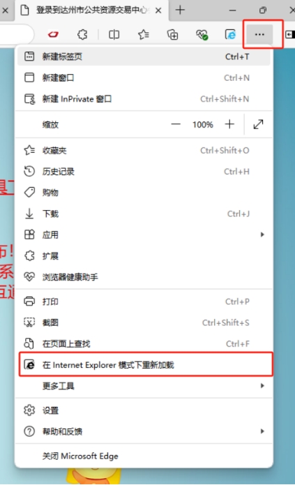 首先确定是使用的IE模式,点击浏览器右侧“...”三个点,再点击“在Internet Explore模式下重新加载”,切换到IE模式。