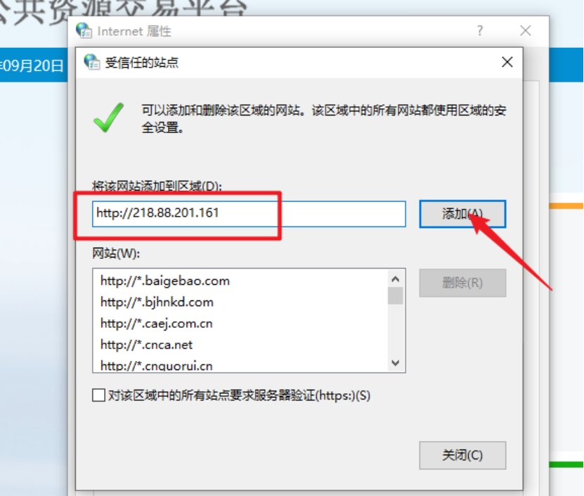 输入系统服务器的IP地址,格式例如:http://218.88.201.161然后点击“添加”按钮完成添加,再按“关闭”按钮退出。