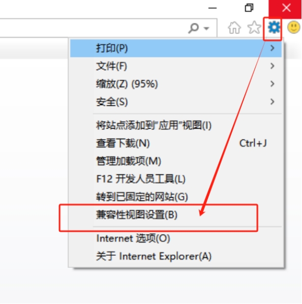 5、兼容性设置,点击浏览器右侧上方设置按钮,打开菜单,点击“兼容性视图设置”,再点击添加按钮,最后关闭即可。