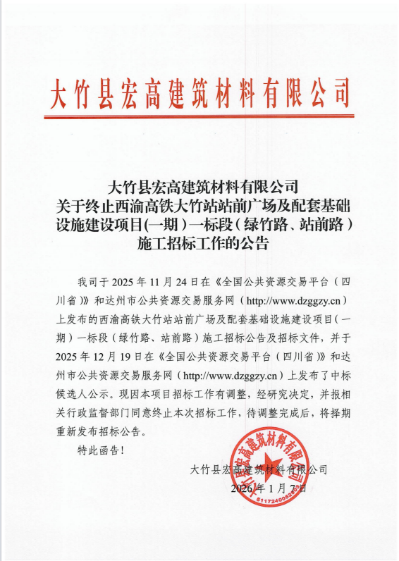 大竹县宏高建筑材料有限公司关于终止西渝高铁大竹站站前广场及配套基础设施建设项目(一期)一标段(绿竹路、站前路)施工招标工作的公告