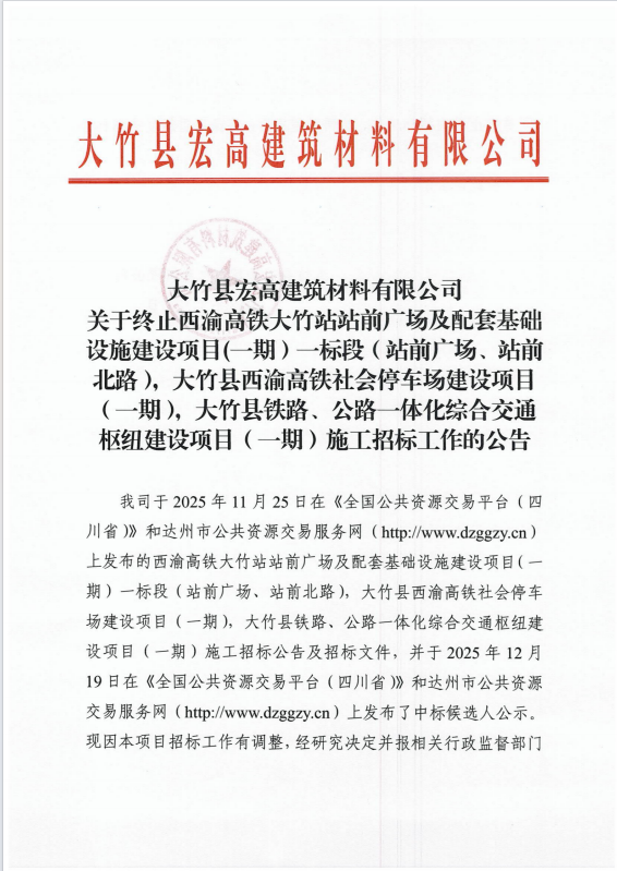 大竹县宏高建筑材料有限公司关于终止西渝高铁大竹站站前广场及配套基础设施建设项目(一期)一标段(站前广场、站前北路),大竹县西渝高铁社会停车场建设项目(一期),大竹县铁路、公路一体化综合交通枢纽建设项目(一期)施工招标工作的公告