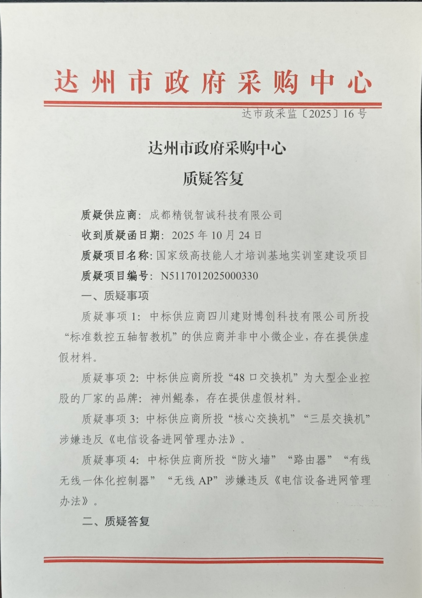 质疑答复
