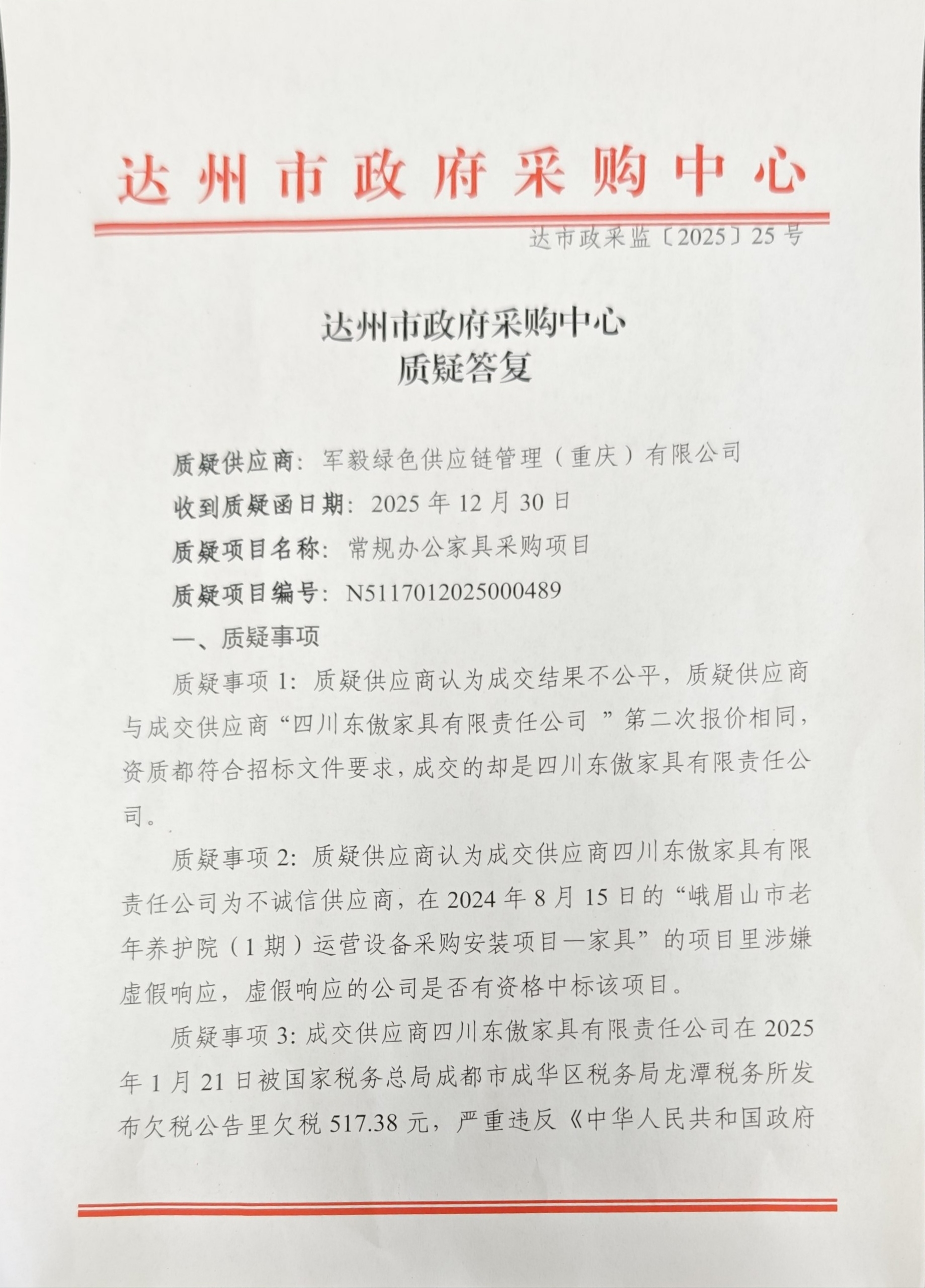 常规办公家具采购项目质疑答复